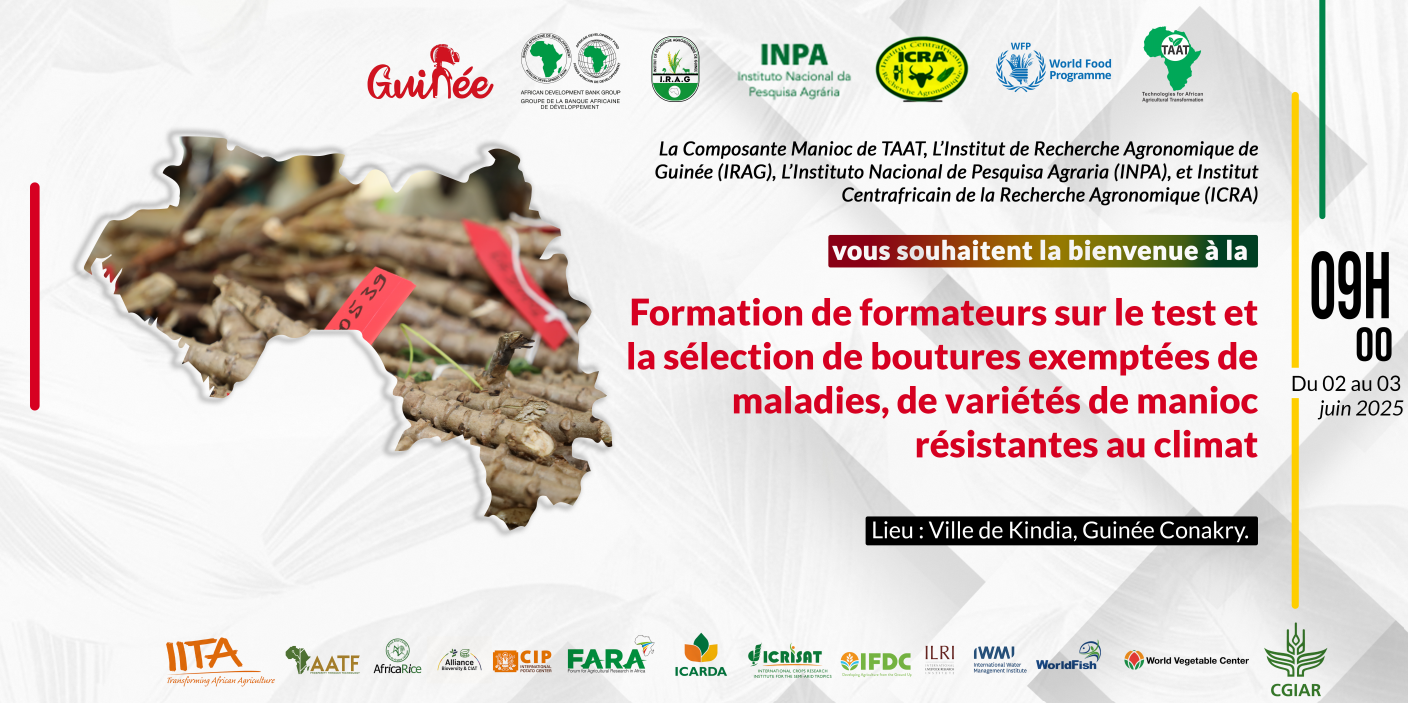With sights set on intensifying the production of cassava disease-free cuttings of climate-resilient varieties in Guinea, Central Africa Republic and Guinea Bissau, Technologies for African Agricultural Transformation (TAAT), in collaboration with National Agricultural Research Centres led by Institut de Recherche Agronomique de Guinée (IRAG – Guinea Agricultural Research Institute), Instituto Nacional de Pesquisa Agraria (INPA – Guinea-Bissau National Agricultural Research Institute), and Institut Centrafricain de la Recherche Agronomique (ICRA – Central African Institute of Agricultural Research), has held a two-day Training of Trainers (ToT) workshop in Guinea Conakry.